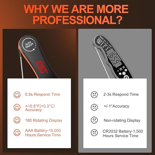 - Professional Accuracy ±0.5°F. This digital meat thermometer has superior accuracy specifications of ±0.5°F (or ±0.3°C). This high accuracy ensures that you can accurately control the temperature of your food to avoid overcooking. It is also specially calibrated to ensure accuracy when measuring meat temperatures