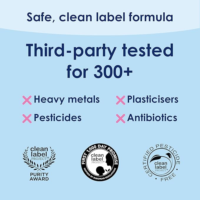 - CLEAN & TRUSTED: Meets rigorous European and U.S. manufacturing and safety standards and is the first goat milk-based infant formula to earn all three Clean Label Project certifications. Every batch undergoes 300+ independent checks for purity and safety, including heavy metals, pesticides, antibiotics, and plasticizers.