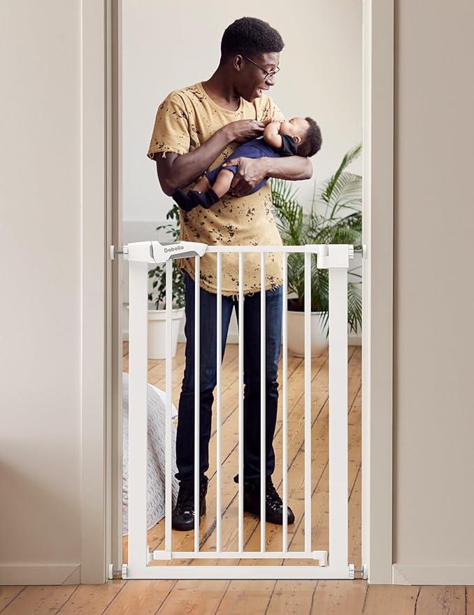 BABELIO 36" Tall Narrow Baby Gate, 26-28.5" Wide Auto-Close Metal Pet Gate for Small Stairs/Doorways/Hallways, Pressure/Hardware Mounted for Child and Pets, NO Extensions, White