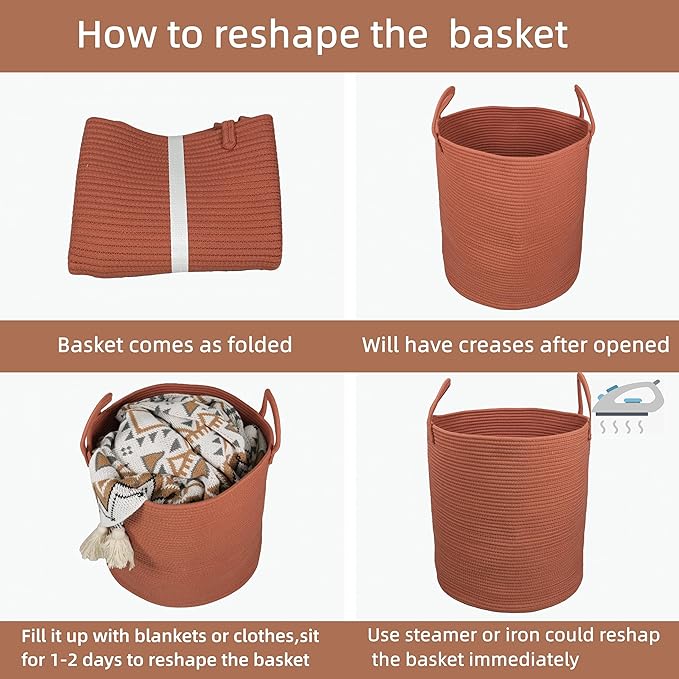 - Note: Laundry basket comes folded and may have creases. Fully filling the laundry hamper with towels or clothes and waiting for 1-8 days will help reshape the laundry basket. You can also use steam or ironing to reshape the laundry basket. The rope hamper is machine washable. If machine washing the laundry hamper, please put it in a wash bag for delicate and air dry it.