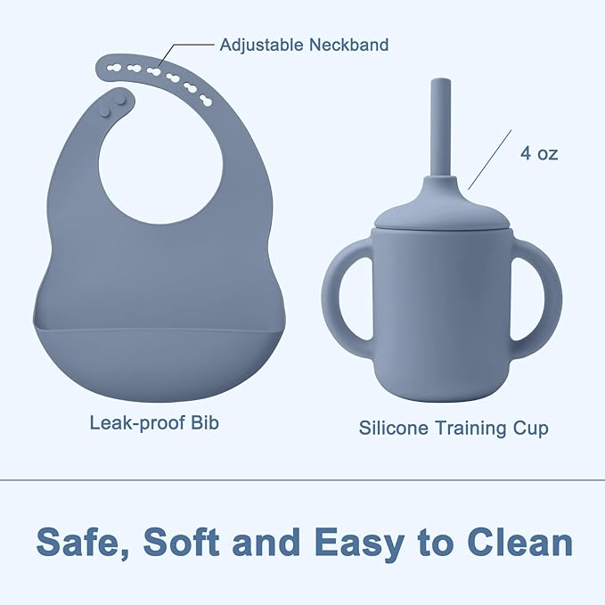 - Baby Led Weaning Supplies: Our silicone bib is designed with a deeper and sturdier pocket, making it highly effective in catching dropped food and easy to clean. The adjustable circular design is particularly gentle on your baby's skin. Our training cup is expertly crafted to fit snugly in your baby's small hands and mouth, safeguarding their developing teeth. Furthermore, the straw is equipped with a spill-proof function, aiding babies in transitioning from breastfeeding and promoting independent drinking.