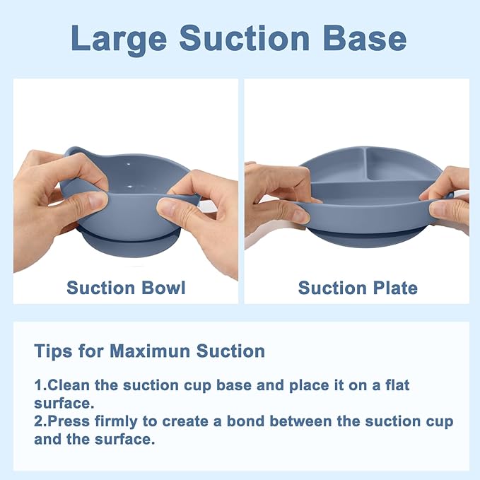- Strong Suction: Our baby plates and baby bowls features a strong suction base that securely adheres to smooth surfaces, including high chair trays, preventing your baby from pulling it off. The divided plate design holds various foods separately, allowing your baby to learn self-feeding without worrying about making a mess on the floor or dropping plates and bowls. Enjoy every mealtime moment with you and your baby.
