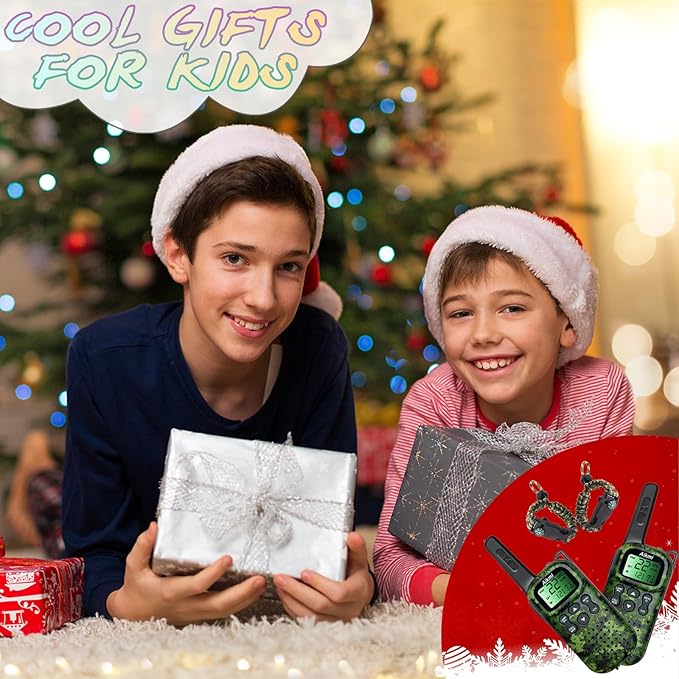 - PERFECT GIFTS FOR BOYS AND GIRLS: These walkie talkies for kids are the ideal gift for any child. With their compact size, great sound, long range, and extended battery life, they are both convenient and easy to use. Whether it's for a birthday, Christmas or any other holiday, these walkie talkies are sure to be a hit with your kid, nephew, grandchild, or your friends' children