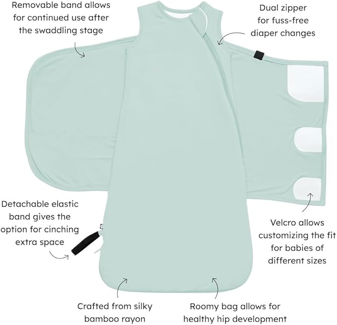- Swaddle Piece: 2 Layers of Soft Bamboo Rayon, Adjustable Velcro Closure