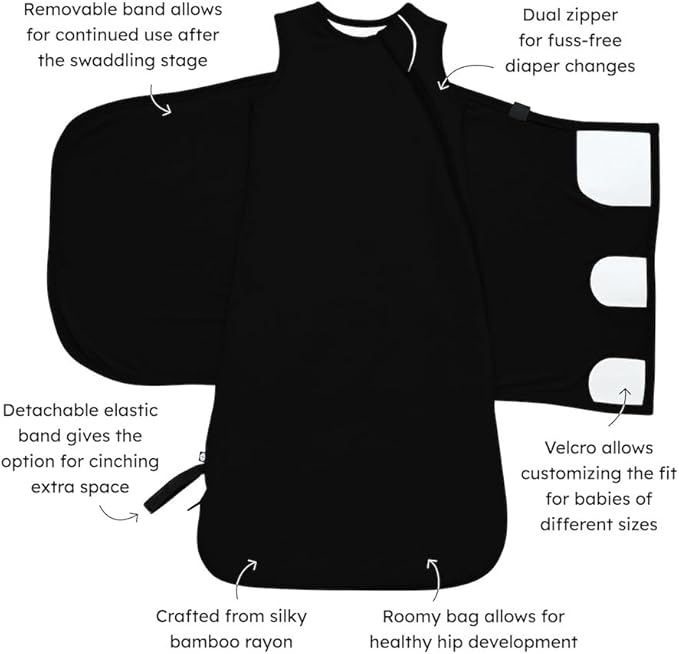 - Fully removable swaddle wrap attached to the sleep bag via Velcro, which allows for different positioning of the swaddle as baby grows.