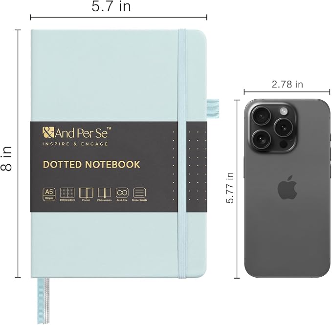 &And Per Se Dotted Journal Notebook, A5 Hardcover Leather Bullet Dotted Journal, 160 Pages 100 gsm Thick Dotted Paper,3 Sheets of Stickers Included - 5.7'' x 8''(Cyan)
