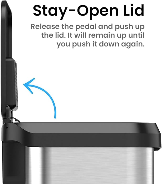 - GENTLE & SILENT LID CLOSE – Durable, ergonomic pedal requires minimal force to open; easy to replace air damper for years of like-new performance of our trashcans for kitchens. Our garbage cans are both easy to use and durable.