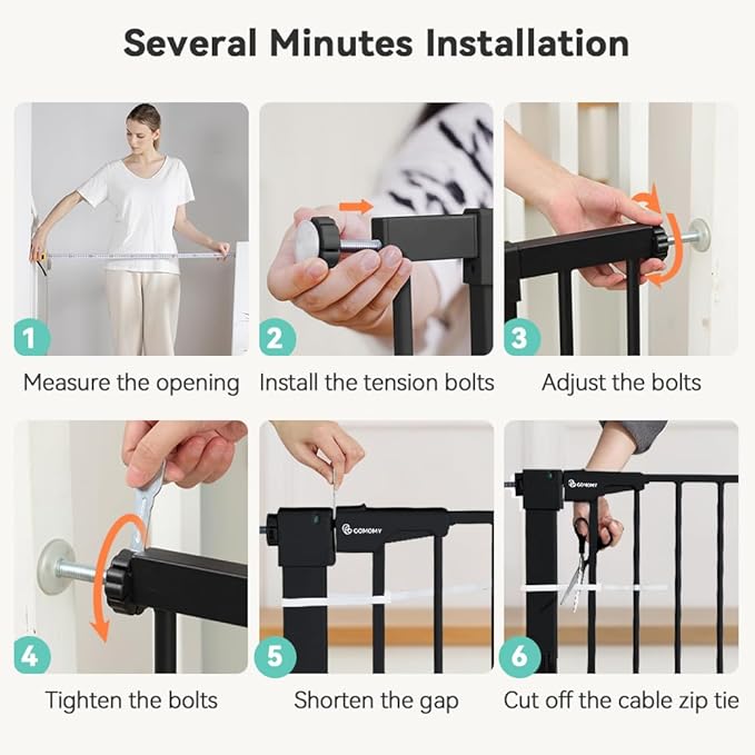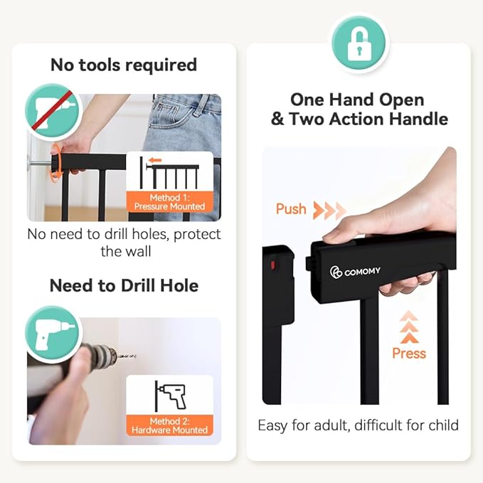 - Enhanced Security Feature: With upgraded safety features, the baby gates for doorways features a double-lock system that requires two buttons to be pressed for it to open. This ensures no accidental openings by either your baby or pets. Notice: Do not cut off the zip tie on the pet gates for dogs before installation is completed, or the gate will completely broken and is unusable.