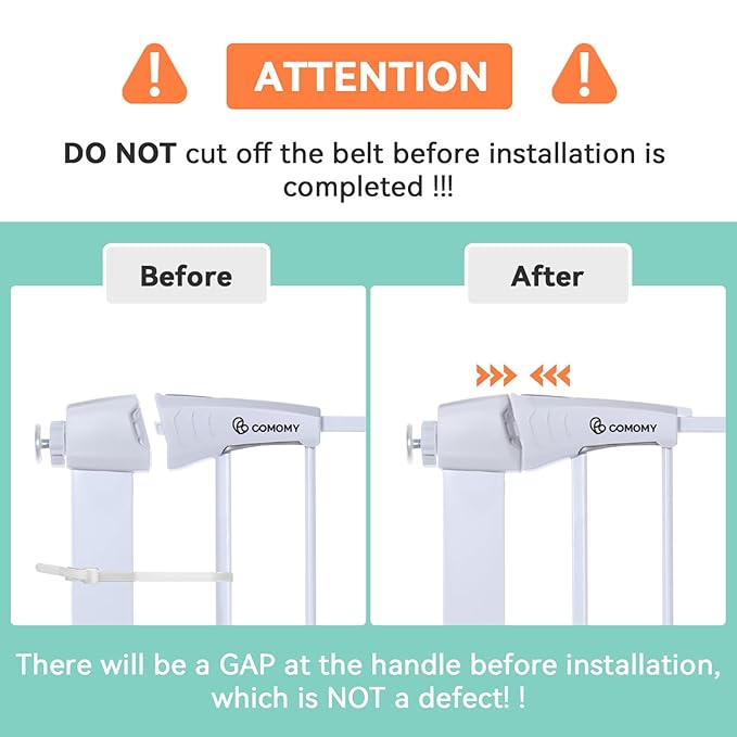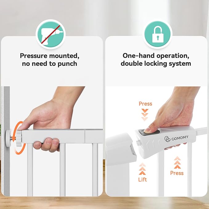 - Enhanced Security Feature: With upgraded safety features, the baby gates for doorways features a double-lock system that requires two buttons to be pressed for it to open. This ensures no accidental openings by either your baby or pets. Notice: Do not cut off the zip tie on the pet gates for dogs before installation is completed, or the gate will completely broken and is unusable.