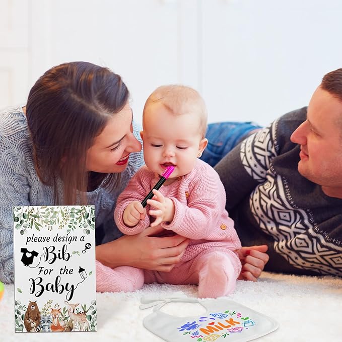 - Reliable Material: the white bibs for baby are designed with 2 layers, featuring a processed surface, and the back is made of waterproof TPU layer, reliable and durable, ensuring that the child's body will not get wet or stained by other stains; The baby shower game sign is made of wood chips, durable and solid; The stencils are made of PET, not easy to damage; The fabric markers are quick drying, fade resistant, weatherproof, can be washed with water; You can use them with confidence