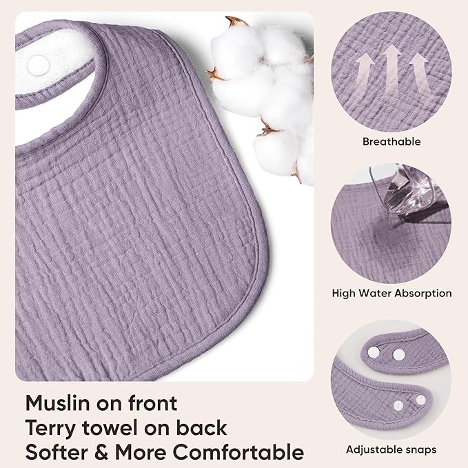 • 100% Cotton: Bearmoss muslin baby bibs are made with 100% cotton material that is soft and gentle for your baby's delicate skin. With soft muslin fabric, making baby bibs lightweight and breathable, also perfect for everyday wear.