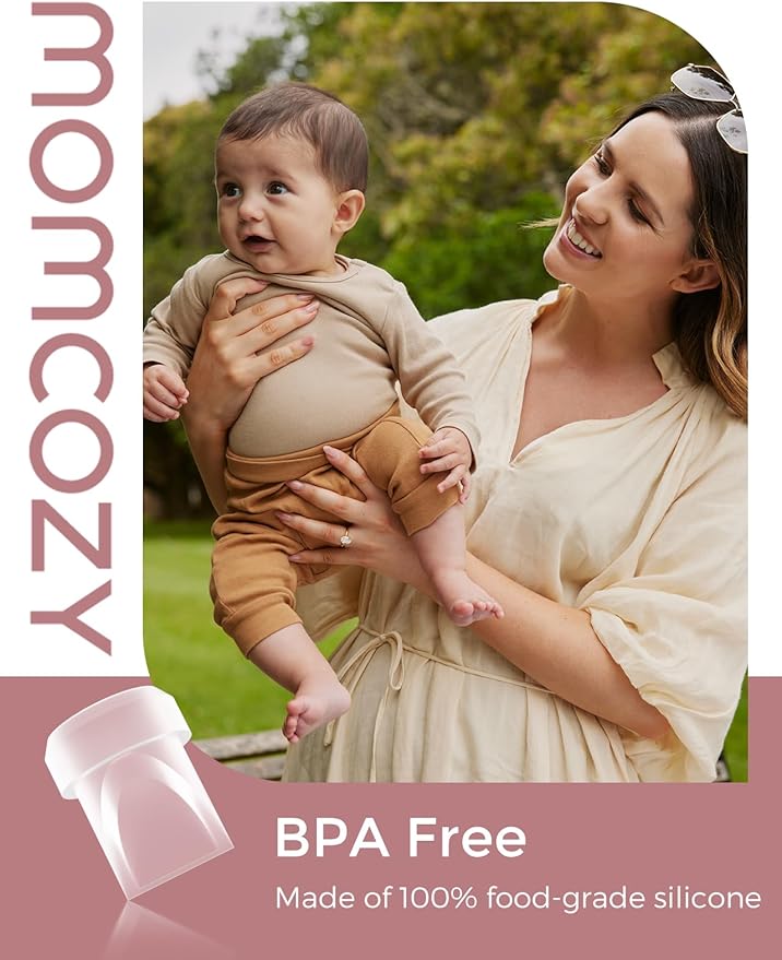 - BPA-free, made of food-grade silicone material. All Momcozy pump parts that come in contact with breast milk are BPA-free, giving you peace of mind about your baby's milk.