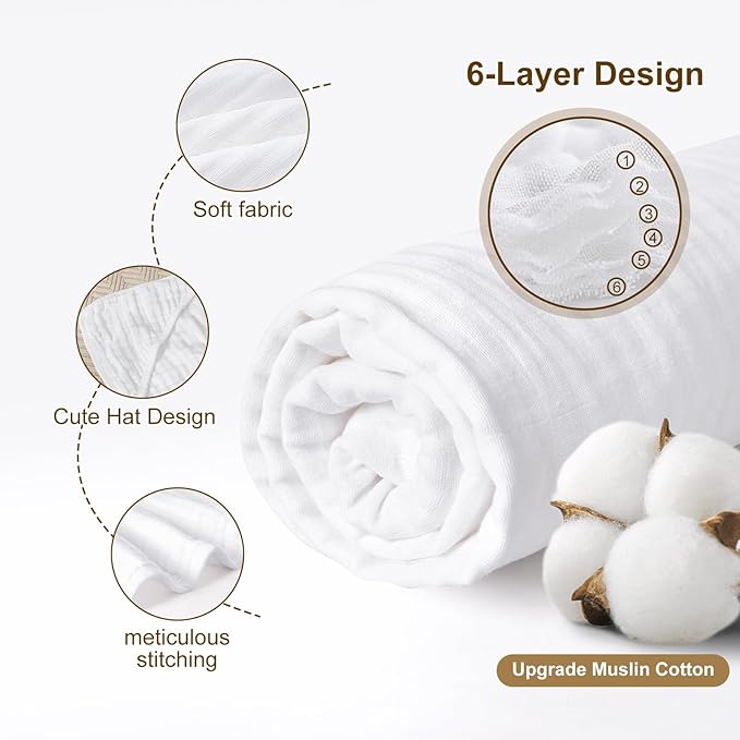 - 100% Muslin Cotton: Our baby hooded towels are made of 100% natural cotton, the premium fabric helps reduce the risk of overheating and performs well in moisture-wicking, keeping babies comfortably wrapped, cozy, and sleeping peacefully. Muslin cotton yarn material feels super soft, so our baby hooded towels maintain excellent softness and breathability.