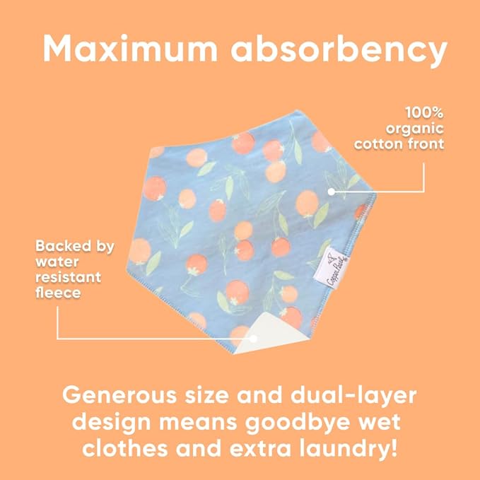 - ABSORBENT COTTON DROOL BIB; These stylish drool bibs are made of 100% absorbent cotton on the front and 100% polyester fleece on the back; The front of the baby bib is a stylish knit fabric and the back is a super soft fleece that keeps your baby completely dry even with the drooliest of babies; Great for teething babies