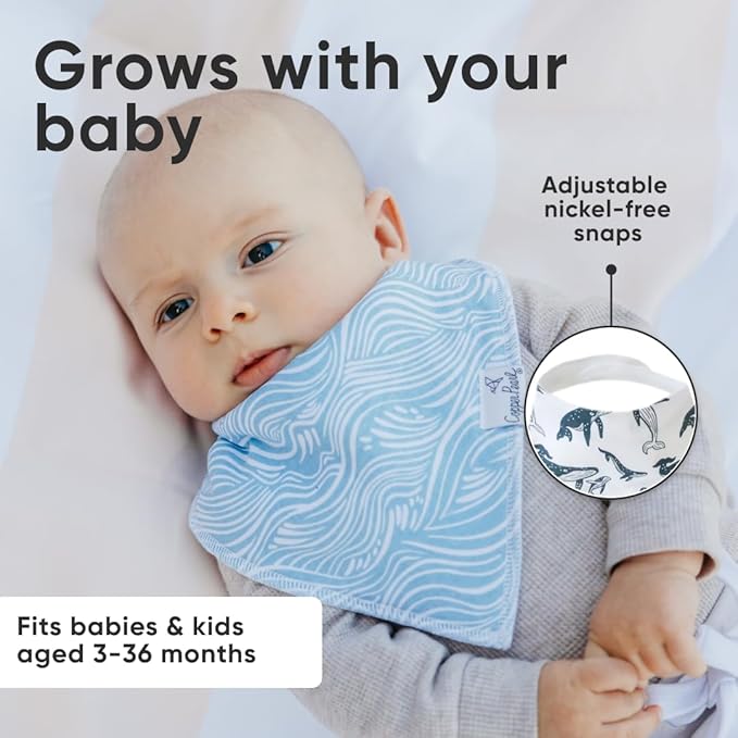 - ADJUSTABLE NICKEL FREE SNAPS; Each baby bandana bib comes with 2 nickel-free snaps that allow each bib to be adjustable in size to fit newborns and toddlers, with ages ranging from 3-24 months; The snaps are secure, making it difficult for infants and toddlers to unfasten but are easy for parents to snap on and off