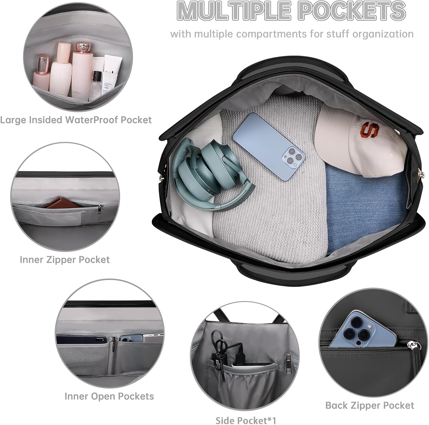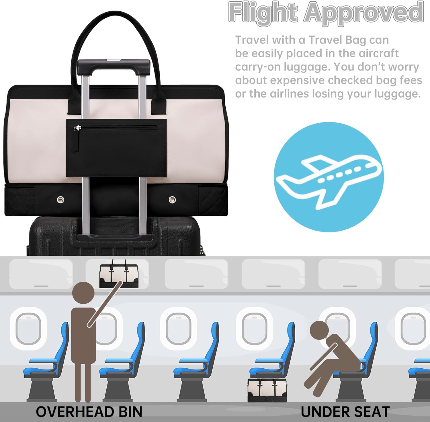 - Extra Large Size Travel Bag for Women: The personal item travel bag featuring multiple pockets and compartments for stuff organization, roomy space can fit in 3-5 days of travel essentials, easily fit into your clothes, toiletries, shoes, laptop and other items. In the back of the duffle bag there is a pocket for easy access your smart phone, IDs or passport. Equipped a built-in USB charging port, perfect for charging your phone or other devices while travel