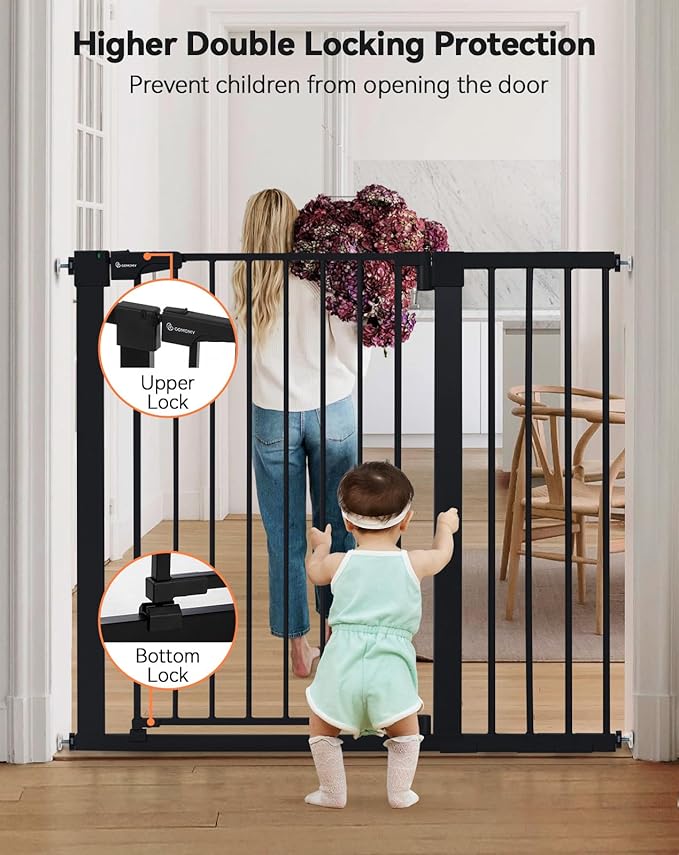 - Double Safety - The pet gate indoor is designed with an auto-close feature for added safety. This baby gate with door, designed with a double-lock system, provides extra safety by preventing your curious toddlers from accidentally opening the door