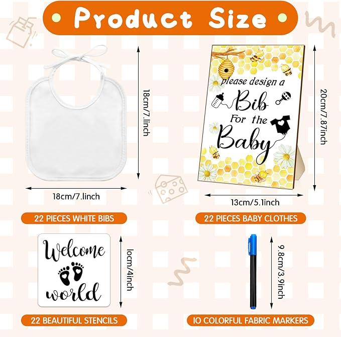 • Package List: you will get 22 pieces of white baby bibs, 22 pieces of stencils, 10 pieces of fabric markers and 1 wooden baby shower game sign, such a complete combination to meet your needs for DIY baby gifts or gift giving