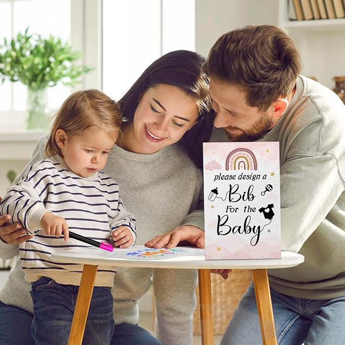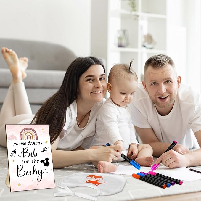 - Reliable Material: the white bibs for baby are designed with 2 layers, featuring a processed surface, and the back is made of waterproof TPU layer, reliable and durable, ensuring that the child's body will not get wet or stained by other stains; The baby shower game sign is made of wood chips, durable and solid; The stencils are made of PET, not easy to damage; The fabric markers are quick drying, fade resistant, weatherproof, can be washed with water; You can use them with confidence