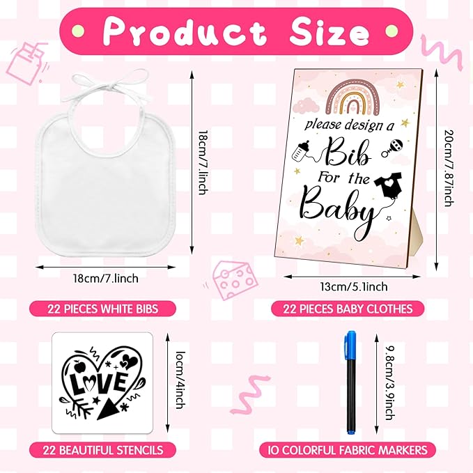- Package List: you will get 22 pieces of white baby bibs, 22 pieces of stencils, 10 pieces of fabric markers and 1 wooden baby shower game sign, such a complete combination to meet your needs for DIY baby gifts or gift giving