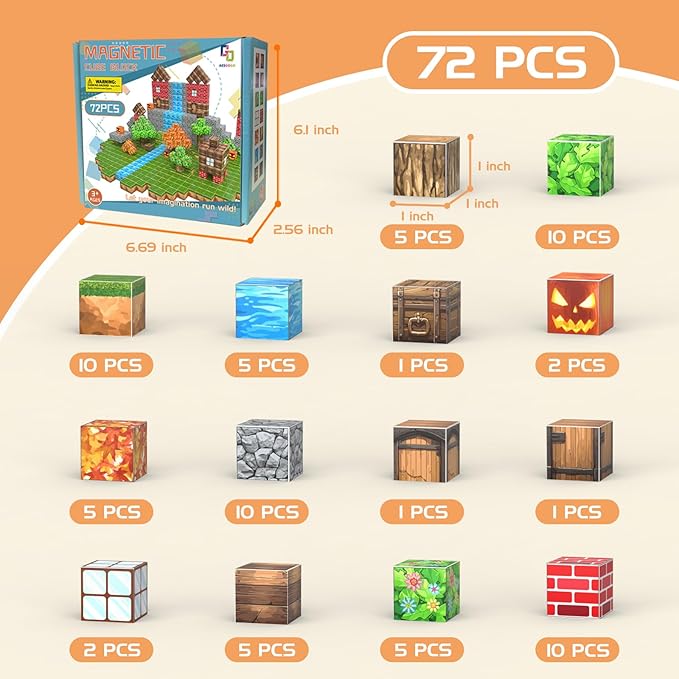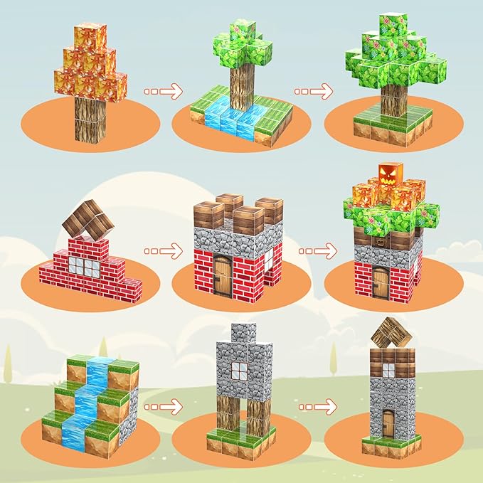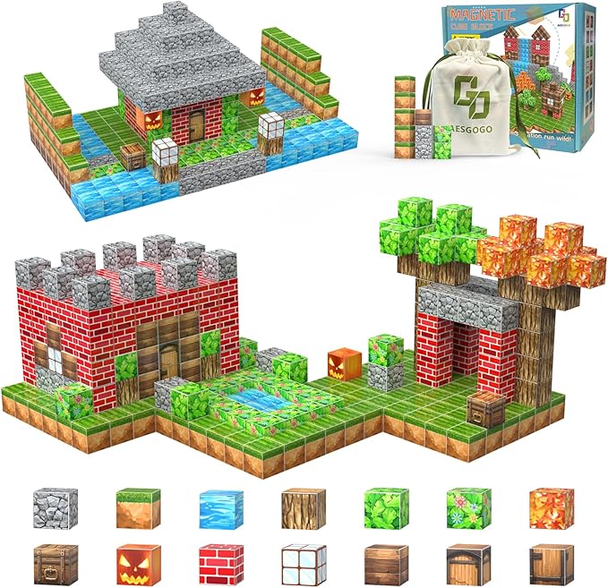 - 【Build Your Own Magnet World】 The magnetic toy set features 14 distinct cube designs, including bricks, grass,stone, water, and more. This variety ensures that there's a wide range of options for young builders, allowing them to create everything from simple structures to complex landscapes.