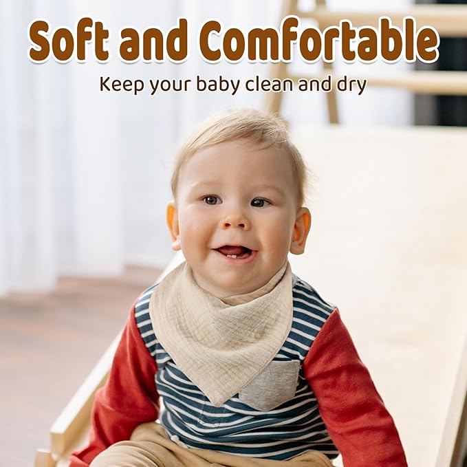- 4.Not only are our bibs stylish, but they're also highly absorbent, keeping your baby clean and dry during mealtime. The premium muslin cotton material ensures excellent absorbency, so you can say goodbye to messy mealtime cleanup. Plus, with two adjustable buckles, our bibs offer a secure and comfortable fit for babies of all sizes.