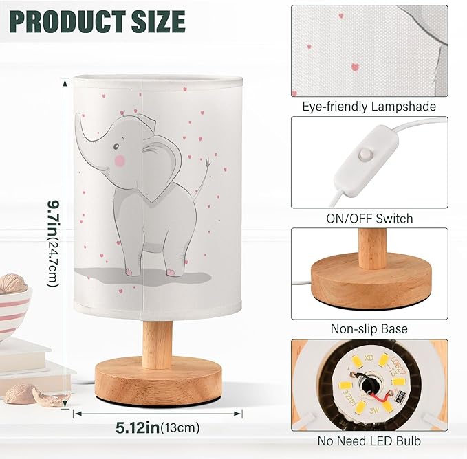Table Lamp Cute Elephant Baby with Love Heart Valentines Day White Nightstand Lamp with Wood Base Fabric Lamp Shade Bedside Desk Lamp for Living Room Bedroom Kids Room Office