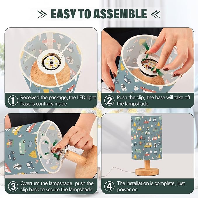 Table Lamp Cute Cars Pattern Cartoon Transportation Doodle Nightstand Lamp with Wood Base Fabric Lamp Shade Bedside Desk Lamp for Living Room Bedroom Kids Room Office