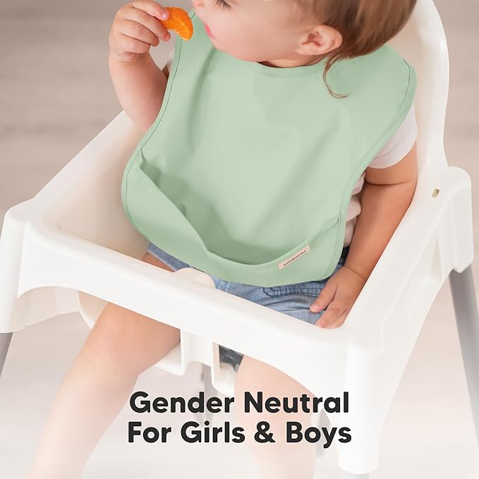 - Covers Upper Chest and Shoulders - Your baby can now enjoy self-feeding without soiling their clothes with the mess-proof bibs. This toddler bib for baby boys and girls comes with a wide food catcher pocket holds fallen food crumbs and purée spills.