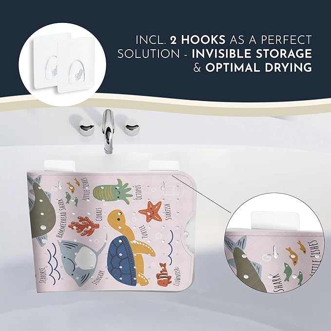- EASY TO DRY! HOOKS INCLUDED - At last, the wet mat is no longer on the edge of the bath tub! Thanks to 2 self-adhesive hooks that can be removed without leaving any residue, the anti-slip bath mat can dry perfectly!