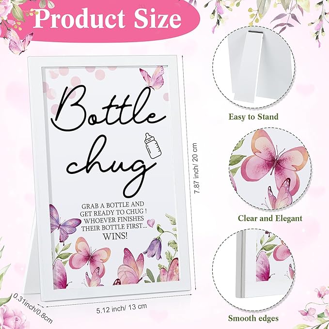 - Functional and Beautiful Designs: the butterfly theme baby shower game sign is decorated with green leaves, elegant and attractive in appearance, and can add more charm to your party; Besides, its surface is printed with explainable words, which allow the guests to understand how to play this bottle chug game at once