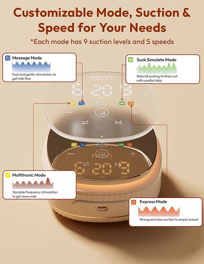- Customizable Pumping Experience: Featuring 4 modes, 5 cycle speed and 9 suction levels. The electric breast pump 8116 allows you to tailor each session to your comfort and needs, whether it's for stimulation or deep suction