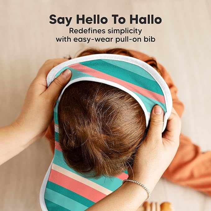 - For Active Infants, Toddlers - The Hallo Baby Teething Bib features a pullover lap shoulder design—no snaps, easy to put on. Just slip it over the baby's head like a t-shirt, and you’re all set. It stays on all day, even for the most active toddler.