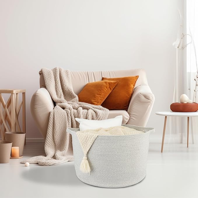 Large Cotton Rope Basket – 22"x14" Woven Storage Baskets for Blankets, Toys, Laundry, and Nursery – Round Basket for Living Room, Kids, and Pets Grey