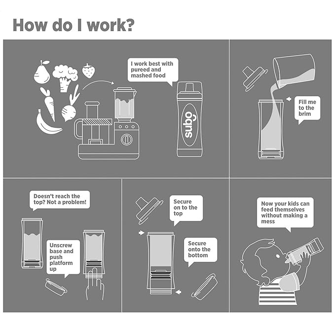 - AUTOMATIC PLATFORM: The Subo food bottle is the perfect feeding solution for young children, starting at just 4 months old with rice cereal or level one purees using the 5mm (1/4 inch) spout (included in the Starter Set). This bottle allows children to easily sip and enjoy their food through a soft silicone spout. The platform inside the bottle automatically moves up as the child consumes the food, ensuring they get every last bit without any struggle. This makes mealtime fun and stress-free.