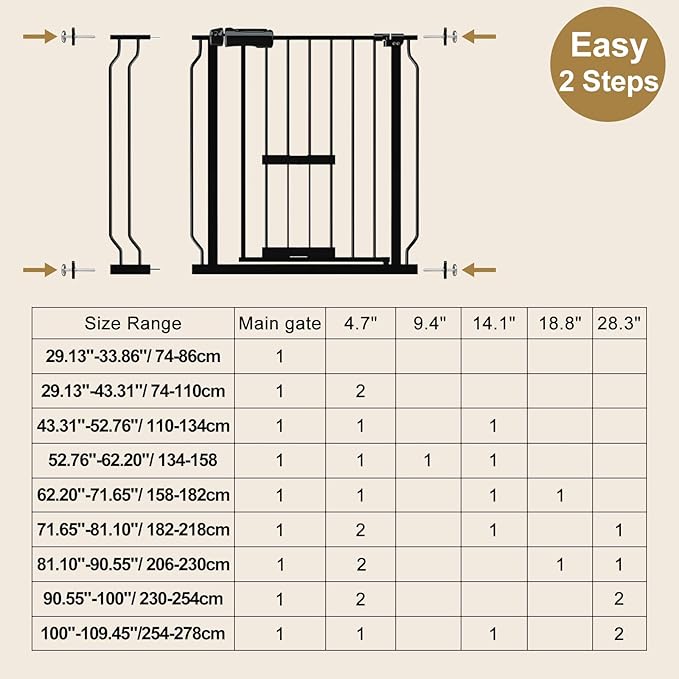 - Extra Wide Gate:The pet gates with doors are available in a variety of sizes, ranging from a minimum of 29.13 inches - 33.86 inches to a maximum of 100 inches - 109.45 inches. Suitable for use in a variety of locations such as doorways, stairs, hallways and kitchens, the pet gate effectively prevents small dogs or babies from entering dangerous areas