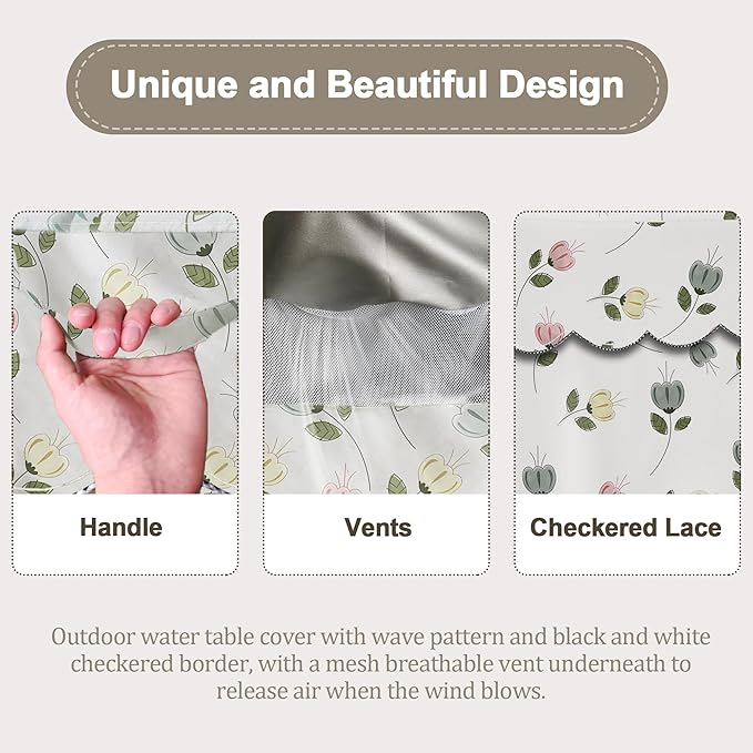 - [Lovely Design]Outdoor water table cover with wave pattern and black and white checkered border, with a mesh breathable vent underneath to release air when the wind blows. The bottom has elastic folded edges and 3 straps. Just fasten and pull the drawstring tight, the cover will be securely fixed on the water table and won't be blown away by the wind