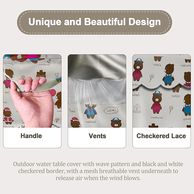 - [Lovely Design]Outdoor water table cover with wave pattern and black and white checkered border, with a mesh breathable vent underneath to release air when the wind blows. The bottom has elastic folded edges and 3 straps. Just fasten and pull the drawstring tight, the cover will be securely fixed on the water table and won't be blown away by the wind