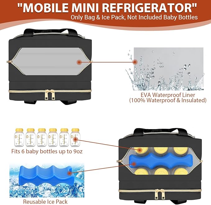 - PORTABLE COOLER BAG - The cooler bag is made of waterproof& leakproof EAV inner, just like a ”mobile mini -fridge” keeps breastmilk/formula fresh for hours. It's a waterproof liner to prevent leakage and fits 6 baby bottles up to 9 ounces or some infant's milk storage bags.
