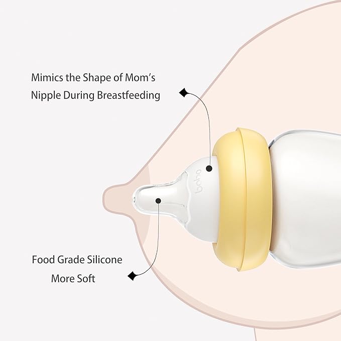 - YOHKOH Natural Baby Bottles are made of high quality borosilicate glass, pure and clear without impurities. Paired with a liquid silicone nipple, it can help empty the bottle of air, and the baby can comfortably complete the feeding.