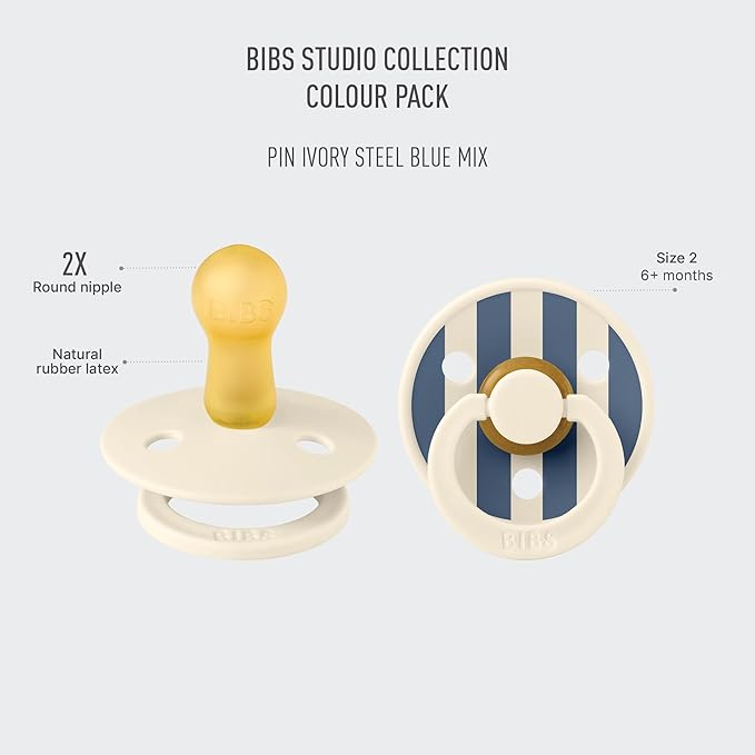 BIBS Pacifiers - Studio 2 Pack | Round Nipple Baby Pacifier | BPA Free Natural Rubber Latex Soother | Made in Denmark | Size 6+ Months | Pin Ivory Steel Blue