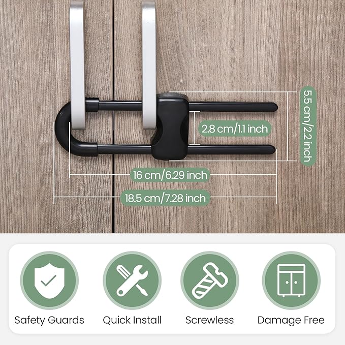 - Sturdy ABS material: made of quality ABS material ensuring more durability, the child safety cabinet lock is designed to work well with cabinets or cupboards with knobs or handles in a row; Please be in mind that the sliding cabinet lock is adjustable, and ensure knobs are less to 4.7 inches/ 12 cm between each other
