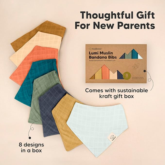 - Ideal Baby Gift - The 8-Pack Lumi Muslin Organic Baby Drool Bibs come beautifully packaged in a sustainable kraft box, making them a cute and thoughtful present for baby shower, baby registry, Christmas, and birthdays.