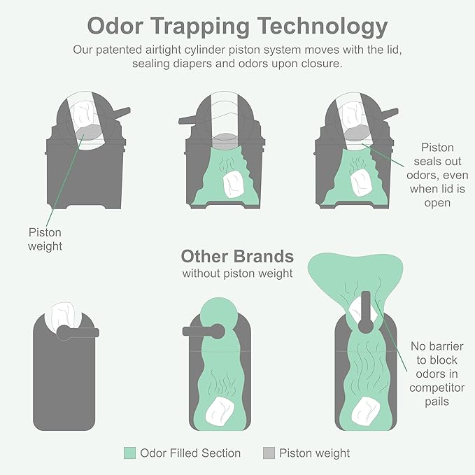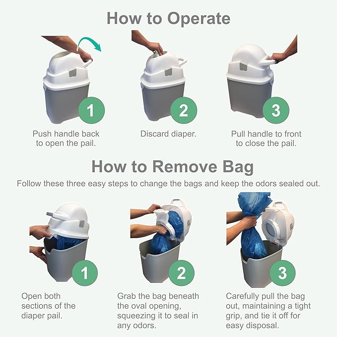 - Simple Operation: Simply lift the handle, drop the diaper into the sealed compartment, and close the lid. The weighted system then releases the diaper into the bag, keeping odors contained with ease.