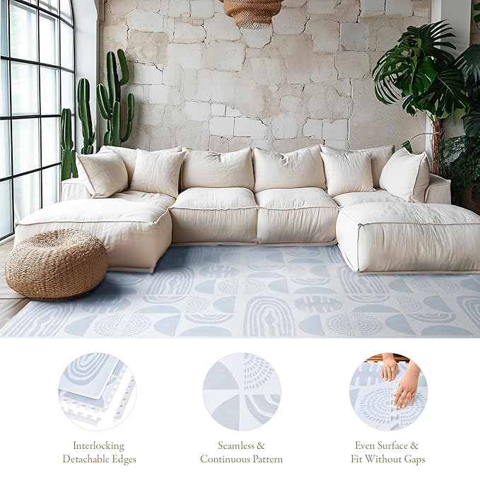 - 【Enhanced Specifications】Include 6 interlocking 24x24x1 inches tiles & 10 border pieces. Each 1-inch thick tile weighs 800g, offering stability and security. The mats cover a large surface area, making them perfect for any playroom or nursery. They are ideal for high-traffic areas, providing a robust and reliable play surface for your children. To maximize both the aesthetics and functionality of your play mat, choose a size configuration that covers the entire room/space.