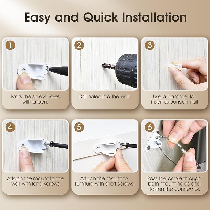 - 【EASY TO INSTALL】Installing the anti-tip furniture straps to secure dressers and other large furniture takes only a few minutes, and might save a life. Follow the instructions, use all the hardware pieces in the package, it’s easy to install with a screwdriver and a drill driver. Besides, vertical or horizontal siding installation can be chosen for different furniture.