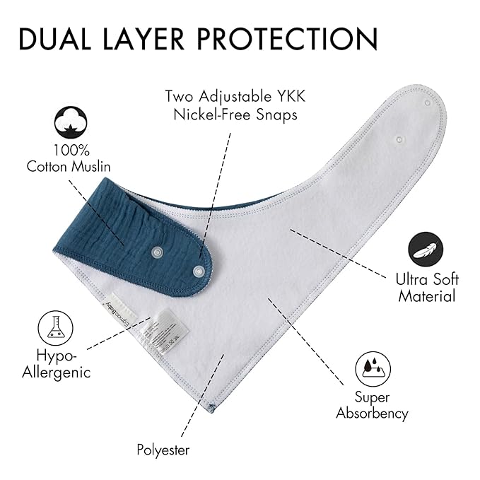 - Super Absorbent Muslin Bandana Bibs - Egmao baby muslin bandana drool bibs are made of soft organic cotton (Muslin) on the front and polyester on the back for added absorbency. Drool bibs for baby boy girl and this dual layer design helps to keep your baby clean and fresh all day long.No more drool rings on your baby's clothes!Most important the quality of fabric also as well as the bright colors with no chemical like smell and that have kept their shape and color after washing