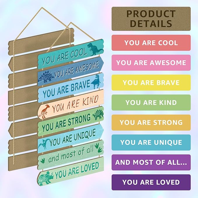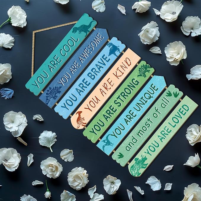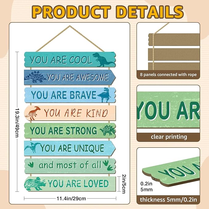 - Dinosaur Decor: This dinosaur wall decor sign is an ideal addition to kids' room decor. Each plaque features a different Dinosaur patterns, lets kids know about dinosaurs which are educational, and the 8 motivational warming words can help boost children's self-confidence