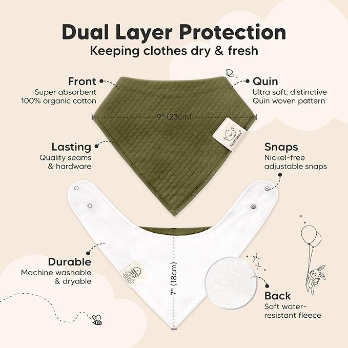 - Super Absorbent - Our organic baby drooling bibs are made with 100% organic cotton (GOTS-certified) Quin fabric and backed with water resistant fleece for added absorption. This dual layer design helps to keep your baby clean and fresh all day long.