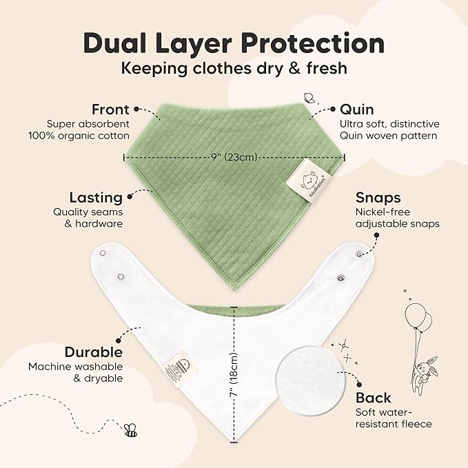 - Super Absorbent - Our organic baby drooling bibs are made with 100% organic cotton (GOTS-certified) Quin fabric and backed with water resistant fleece for added absorption. This dual layer design helps to keep your baby clean and fresh all day long.